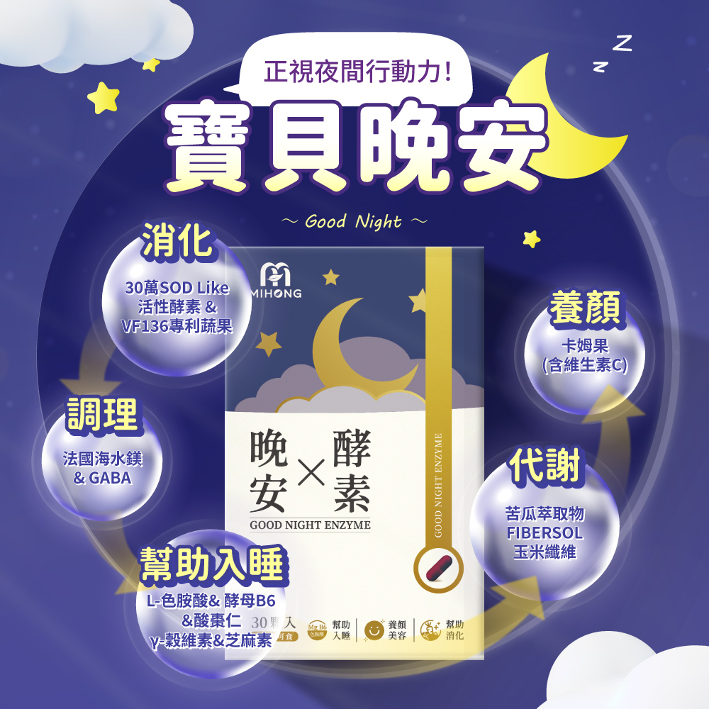 A:因為MIHONG®晚安X酵素可以幫助入睡,熬夜吃大餐的人幫助消化,睡著的時候可以調節生理機能養顏美容。加強幫助入睡與幫助消化的原料升級,能夠幫助您,寶貝晚安,正視夜間行動力!
