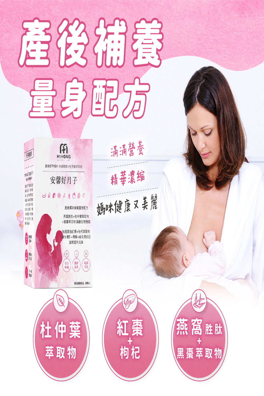 ?MIHONG® 安馨好月子(30顆/盒) - 蔬食好孕媽咪系列 - 月子期適用,把握黃金時期,研製漢方草本精華以及添加燕窩胜肽,讓媽咪產後補養,養顏美容。