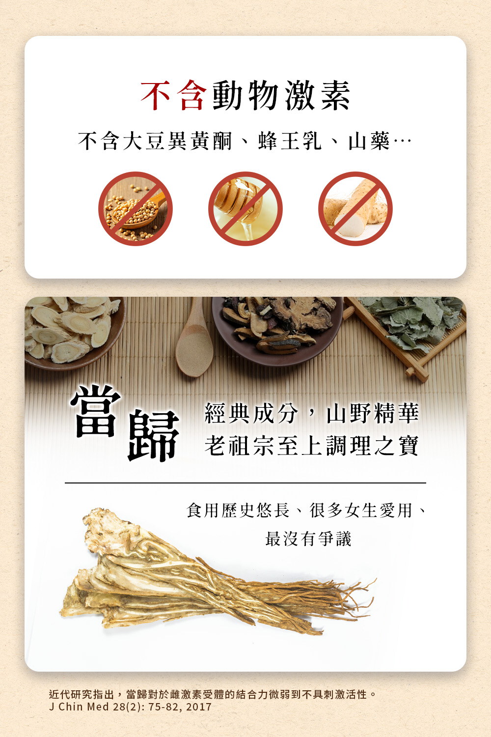 1.挑選古老植萃食材-當歸+益母草+茯苓+黃耆,從食調整,舒活愉悅,調節生理機能。